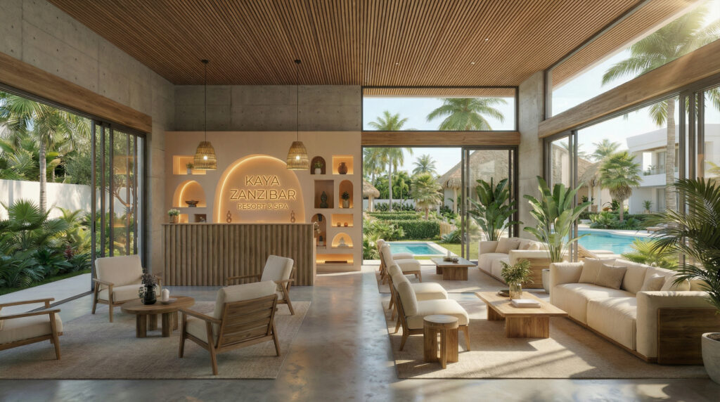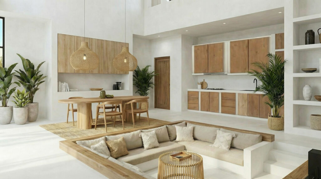 KAYA embraces a tropical minimalist aesthetic, where clean lines meet natural textures. Microcement, rope accents, and straw elements blend seamlessly with open spaces, creating a warm, sensory environment that harmonizes indoor and outdoor living. The style is understated yet luxurious, focusing on simplicity, light, and the natural beauty of the surroundings.